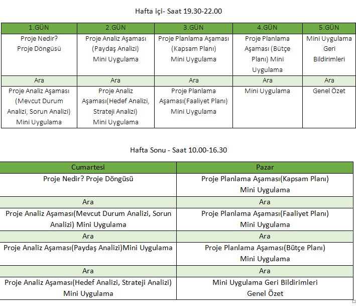 Kimler Başvurabilir: Proje Döngüsü Yönetimi (Project Cycle Management / PCM) metodolojisi ile çeşitli Ulusal ve Uluslararası hibe programlarına proje hazırlamak isteyenler. Yaş ve meslek sınırlaması proje hazırlama konusunda kendini geliştirmek isteyen herkes katılabilir.